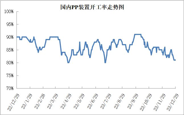 油價震蕩整理,布倫特在80美元附近。前期油價在高庫存壓力下一度大跌,但是在前低附近獲得支撐,且紅海事件引發(fā)市場擔(dān)憂,油價止跌反彈,其中布倫特反彈至80美元附近受阻。雖然油價反彈受阻,但是整體較前期高點(diǎn)下跌較多,且人民幣貶值告一段落開始升值,進(jìn)口成本有所下降,油制PP虧損也較前期明顯改善,目前虧損800元/噸附近。
