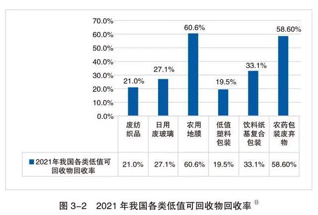 2021年,我國(guó)各類(lèi)低值可回收物總的回收量約為2547萬(wàn)噸,回收率約為26.6%。其中,廢舊農(nóng)用地膜回收率達(dá)到60.6%,農(nóng)藥包裝廢棄物、飲料紙基復(fù)合包裝、日用廢 玻璃、廢舊紡織品、低值塑料包裝的回收率依次為58.6%、33.1%、27.1%、21%和19.5%,總體回收利用率低。