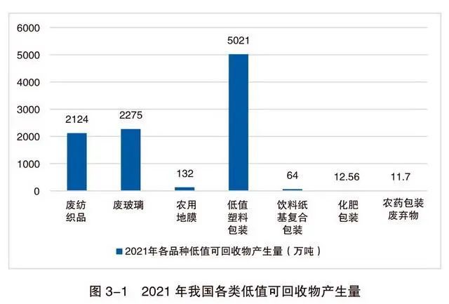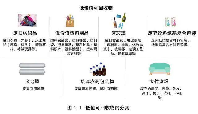 根據(jù)報(bào)告,低值可回收物是一個(gè)與報(bào)廢汽車(chē)、廢家電等高價(jià)值廢棄物相對(duì)的概念,主要是指在生產(chǎn)生活中產(chǎn)生的具有一定回收利用價(jià)值,能夠通過(guò)一定技術(shù)經(jīng)濟(jì)手段實(shí)現(xiàn)材料化回收利用并獲得一定經(jīng)濟(jì)效益的各類(lèi)廢棄物,但由于對(duì)其回收利用的經(jīng)濟(jì)效益較差,單純依靠經(jīng)營(yíng)主體自發(fā)行為難以實(shí)現(xiàn)高比例回收利用,如廢玻璃、廢舊紡織品、飲料紙基復(fù)合包裝、低值塑料包裝、化肥農(nóng)藥包裝、地膜等。